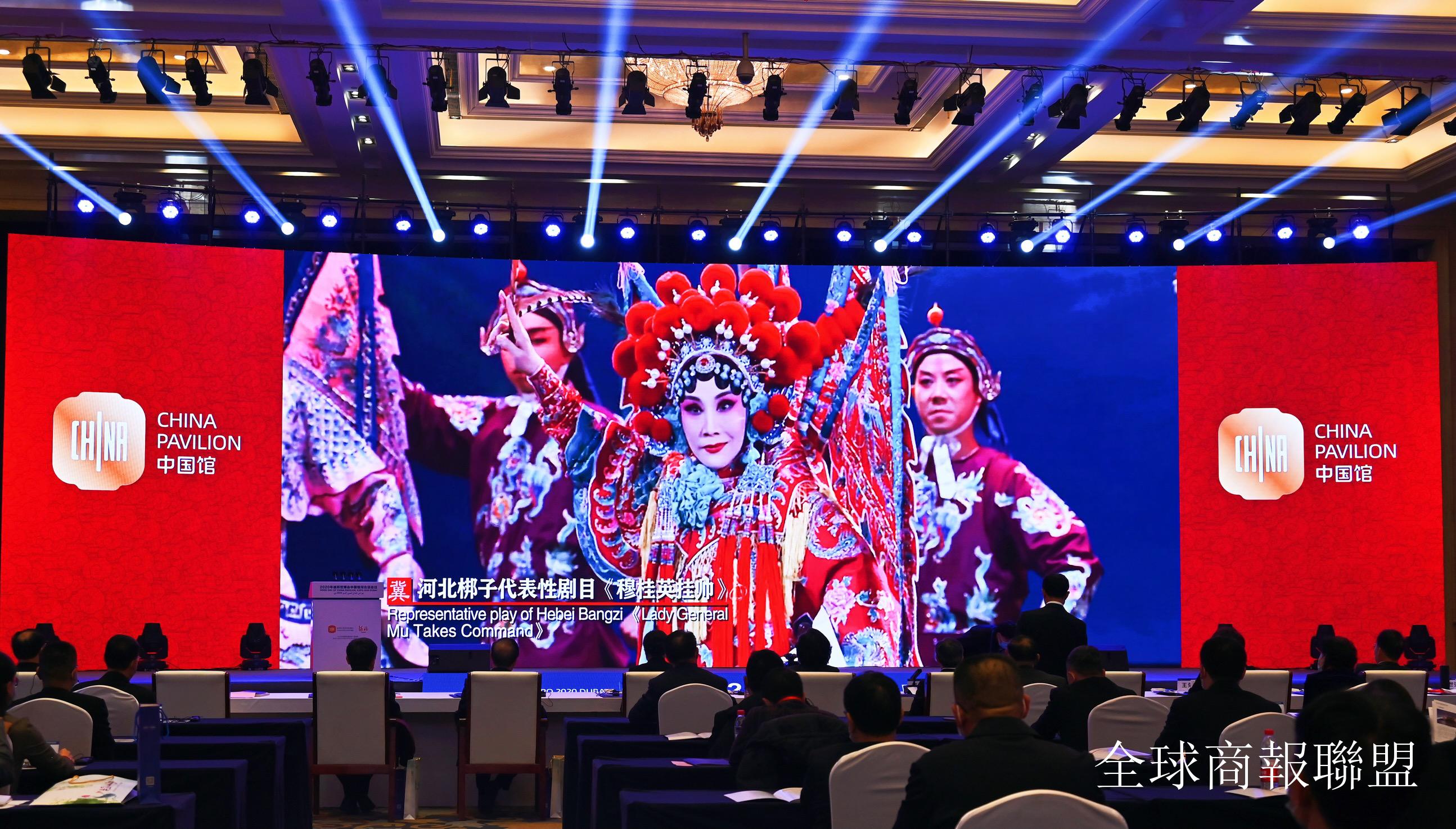 河北石家莊主會場播放2020年迪拜世博會中國館河北活動日演出的河北梆子代表性劇目《穆桂英掛帥》視頻。