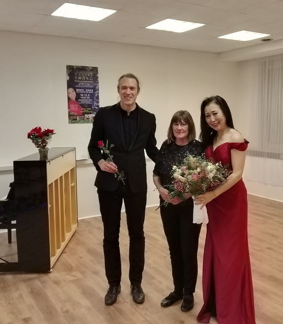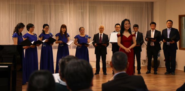 首先音樂會以一首德國最著名的合唱曲 「Heilig ist der Herr」 「聖潔的上帝」 選自舒伯特的 「德國彌撒」 拉開了序幕。接下來,劉偉老師優美的獨唱,意大利歌劇詠嘆調: 「O mio babbino caro」 「我親愛的爸爸」, 和她分別與男高音,女高音的二重唱: 如 「Maria durch ein Dornwald ging」 「瑪麗亞走過荊棘的森林」,「Panis angelicus」 「天賜神糧」 等,然後 Cambell 的男高音獨唱: 「White Christmas」 「白色聖誕節」,王文平的男高音獨唱:「我和我的祖國」, 女生小合唱: 「深深的海洋」, 男女生表演唱:「月亮代表我的心」 「康定情歌」 合唱:著名的德國聖誕歌曲:「Leise rieselt der Schnee」 「輕柔飄落的雪花」, 「The First Nowell」 「聖誕佳音」 等等,最後劉偉老師和 Cambell 的二重唱: 「Angels' carol」 「天使的頌歌」,氣勢宏博的大合唱:萱草花,歌聲與微笑,(領唱:許泠,王文平)和新年好! 在一片熱烈的掌聲中,音樂會完美地拉下了帷幕!整場晚會,選曲精美,結構緊湊,中西結合,構思新穎,恰到好處。確實是一場中外藝術交流的盛會,溫情,甜美,遐逸,所到嘉賓讚不絕口!