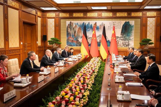 Xi Jinping erklärte, China und Deutschland seien die zweit- beziehungsweise drittgrößte Volkswirtschaft der Welt. Die Bedeutung der Konsolidierung und Entwicklung der Beziehungen zwischen China und Deutschland gehe über den Rahmen der bilateralen Beziehungen hinaus und habe wichtige Auswirkungen auf den eurasischen Kontinent und die ganze Welt insgesamt. Die Industrie- und Lieferketten Chinas und Deutschlands seien tief miteinander verwoben und die Märkte beider Länder seien in hohem Maße voneinander abhängig. Eine für beide Seiten vorteilhafte Zusammenarbeit zwischen China und Deutschland sei kein „Risiko", sondern eine Garantie für die Stabilität der Beziehungen und eine Chance, die Zukunft zu gestalten. Ob in traditionellen Bereichen, wie dem Maschinenbau und der Automobilindustrie, oder in aufstrebenden Bereichen, wie der grünen Transformation, der Digitalisierung und der Künstlichen Intelligenz – beide Länder verfügten über ein enormes Potenzial für Win-Win-Kooperation, das ausgeschöpft werden solle.