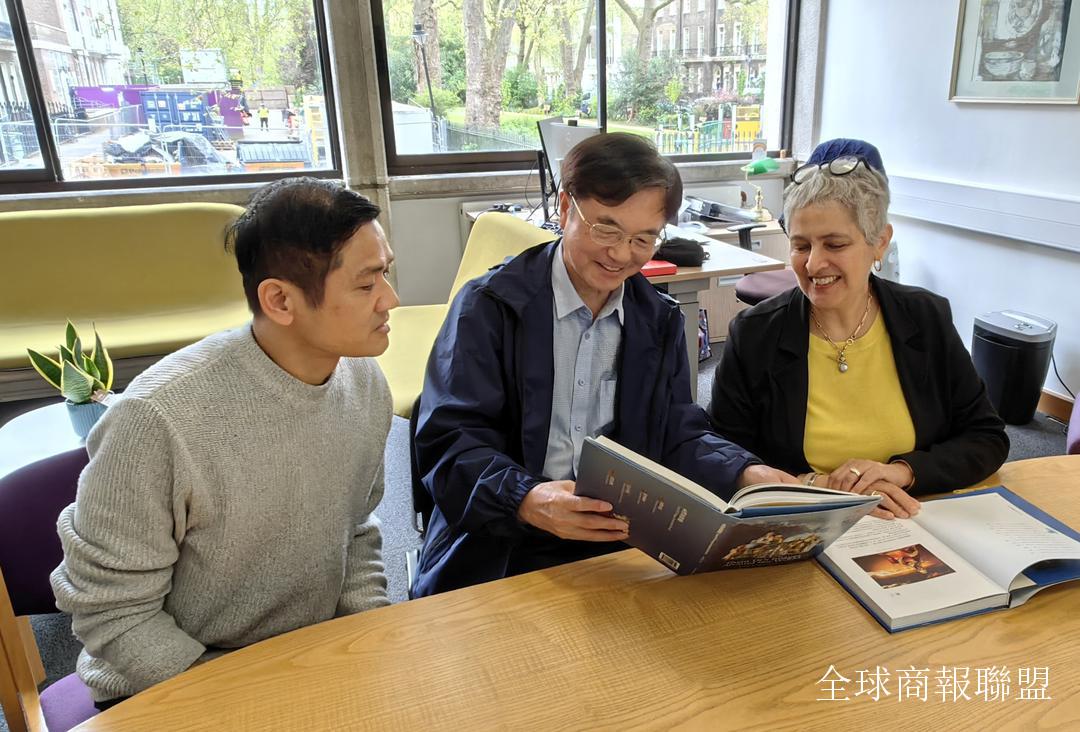 右起: 英國倫敦大學圖書館館長Rookaya BAWA 女士、中國文化學者朱正明、倫敦大學圖書館編目主管Anthony HO先生交流世界關帝文化