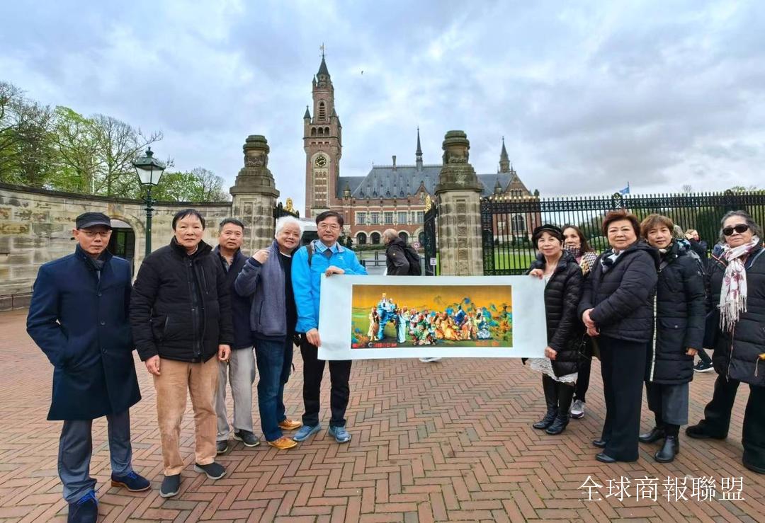 在荷蘭海牙和平宮前,朱正明和眾僑領展示《中華關帝圖》,祈禱世界和平安寧