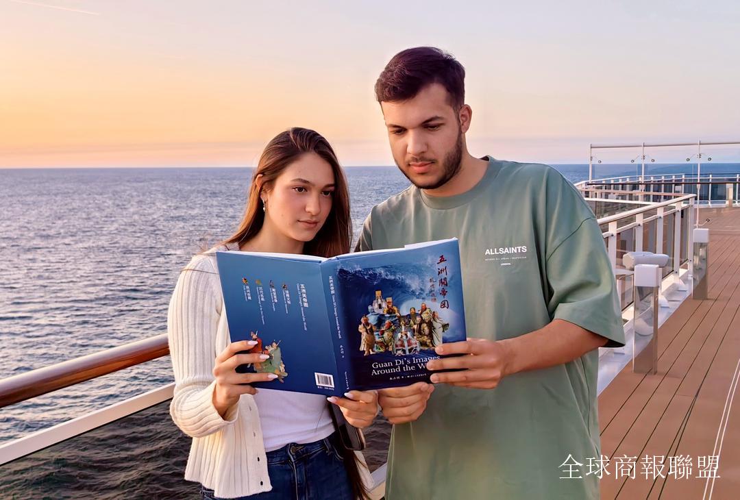 神女號遊輪上,以色列 Roy先生和 Keren小姐拜讀《五洲關帝圖》