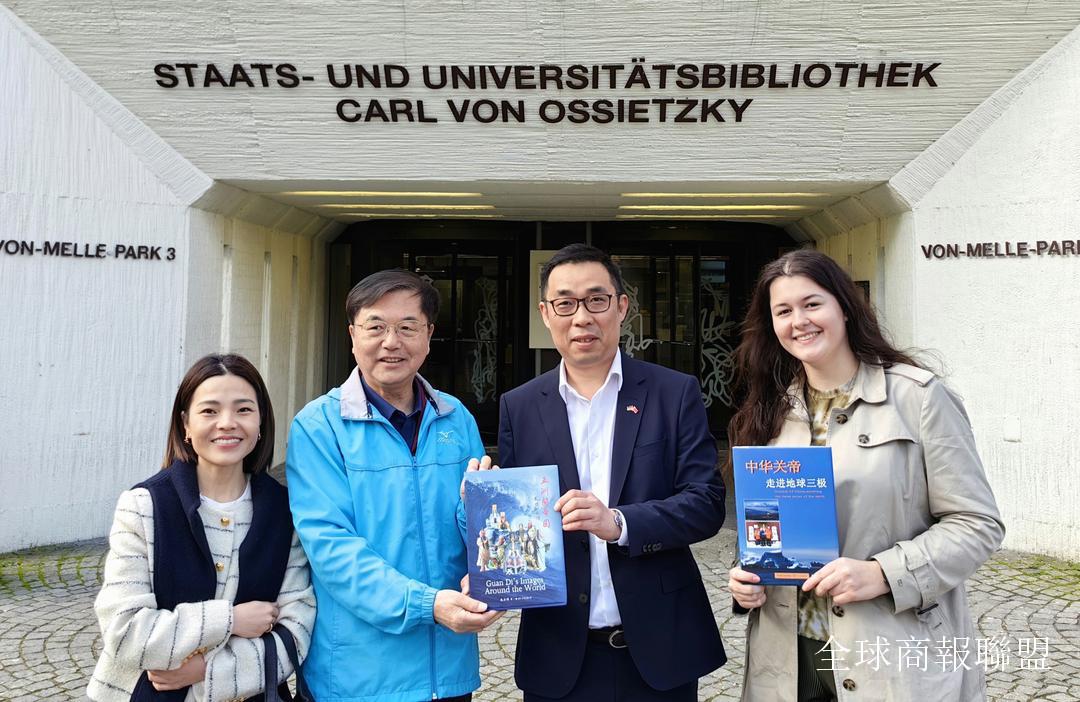 漢堡華人華僑聯合總會秘書長傅鑫先生熱情迎接朱正明,一起來到德國國家和漢堡大學圖書館,向圖書館贈送中英文對照《五洲關帝圖》。在圖書館前,朱正明還向傅鑫秘書長、段曉華文化部長贈送了宣紙大圖《中華關帝圖》,期待德國華人華僑平安發達。